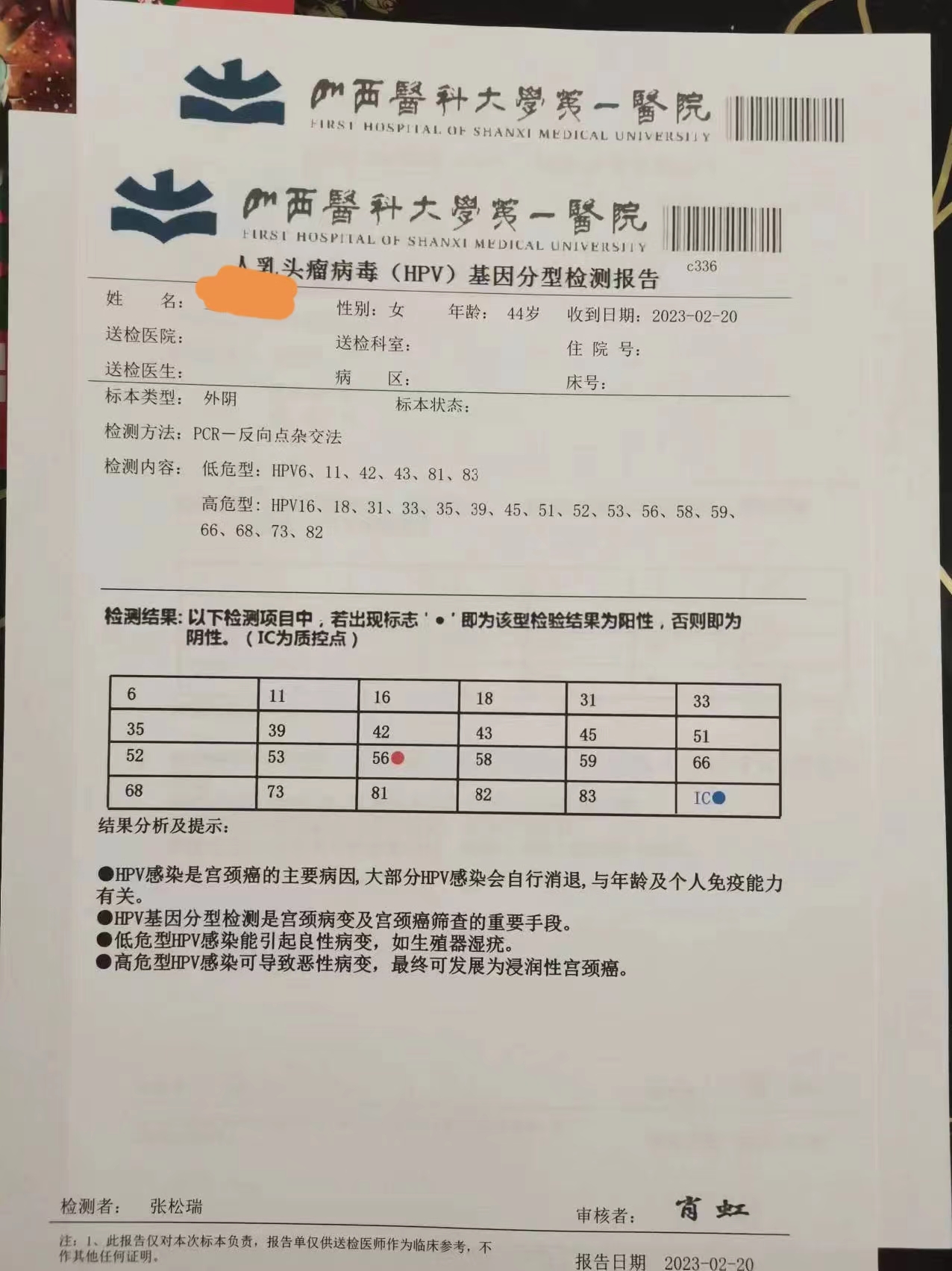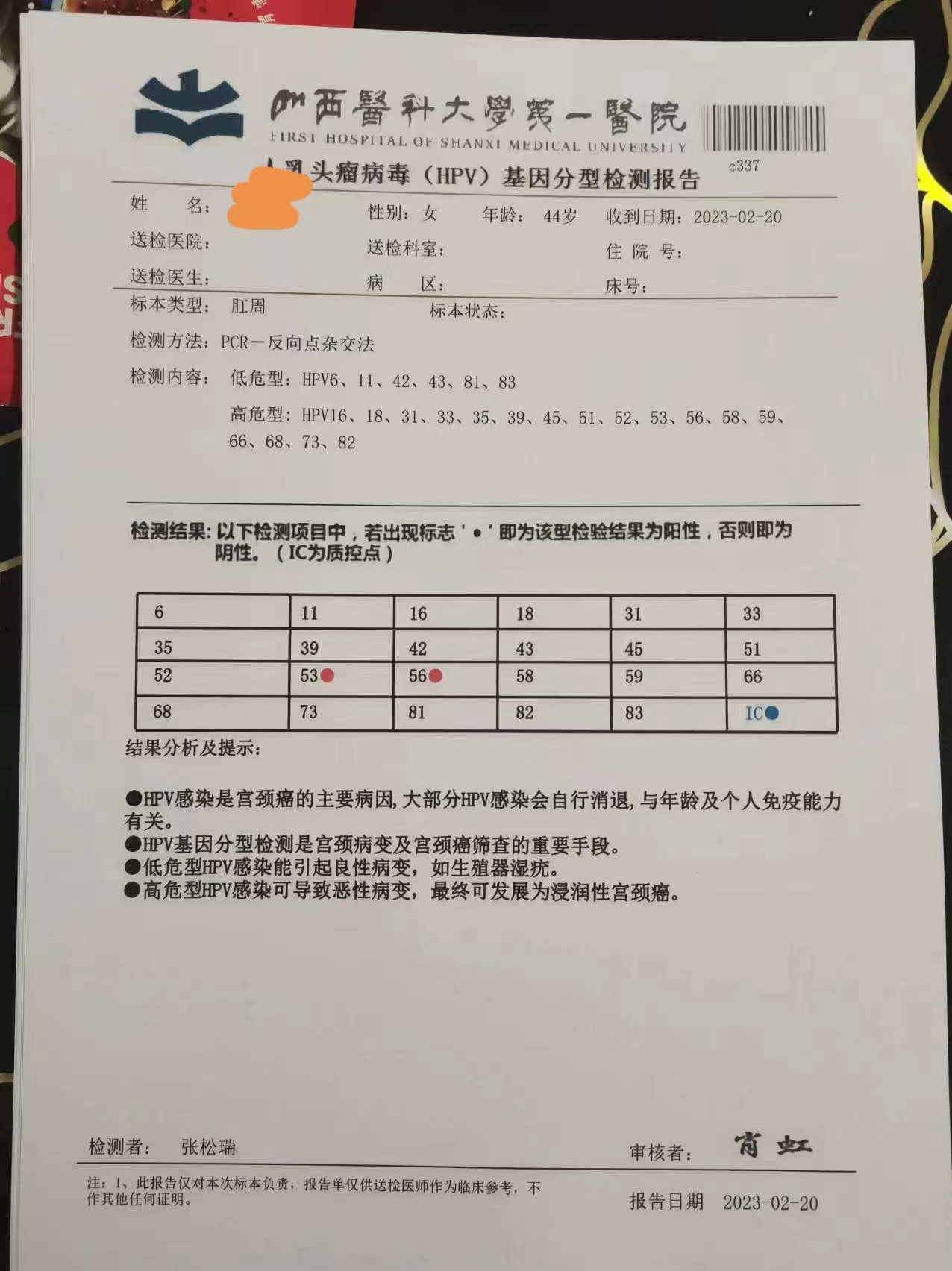 病例分享:山西太原的患者,44岁,2004年6月来我门诊就诊时在尚宁高科检测TCT非典型鳞状细胞不明确意义,hPV正常,治疗一周后复查tct正常。之后每年体检无异常,2022年10月22日来我门诊妇科体检,取标本后外送山大一院检测TCT正常,HPV56阳性,慢性宫颈炎,阴道壁53,56阳性,肛周53阳性,给予胸腺五肽+白介素局部免疫注射,四个部位上中药,口服HPV调理粉等方法治疗一个疗程。2023年2月20日在山大一院检测HPV宫颈已经转阴,继续同前治疗,加油!