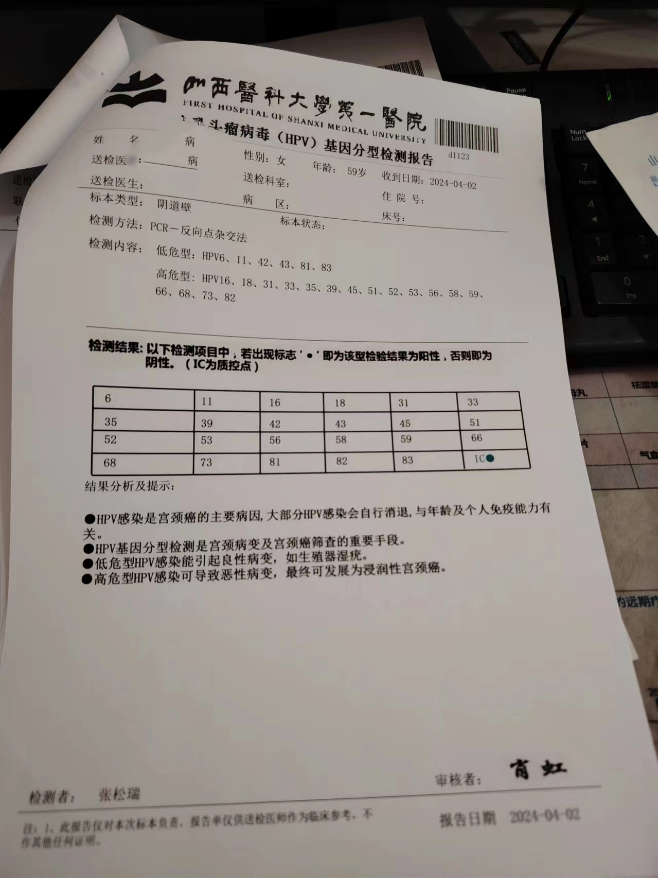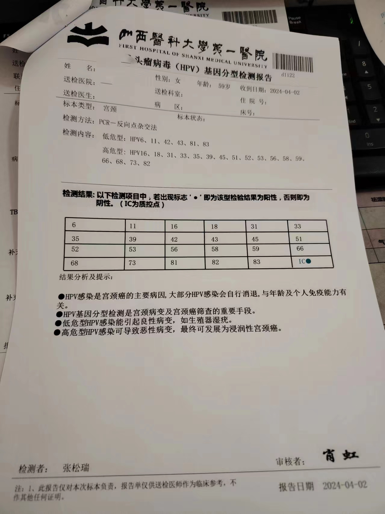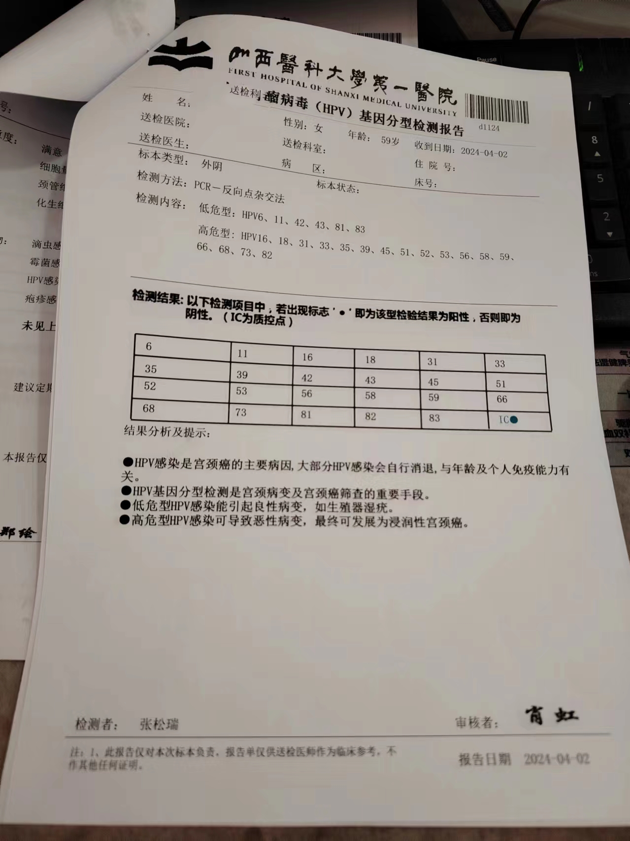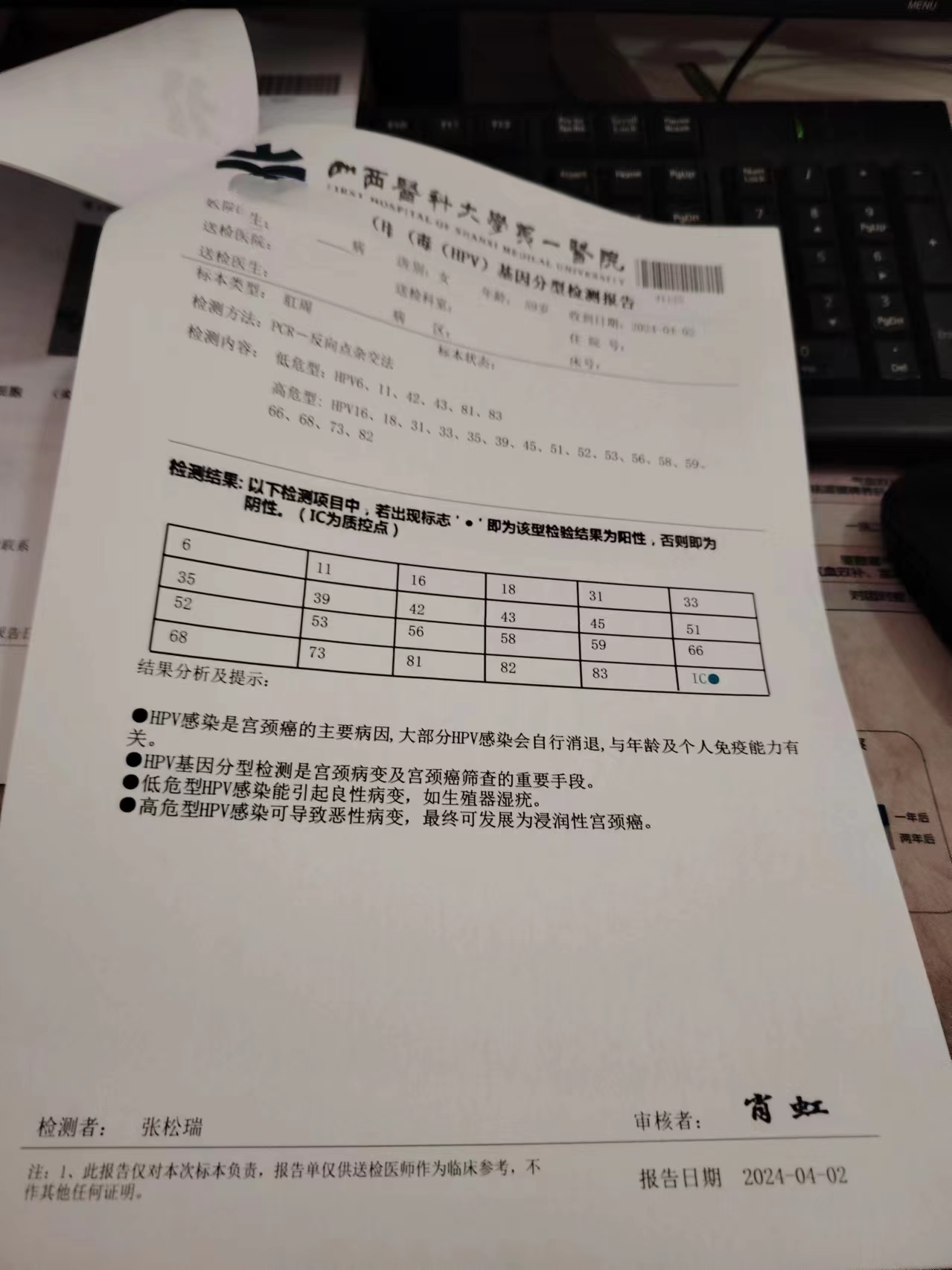 四个部位上中药,微波治疗一次等方法,2024年4月2日,在山大一院检测TcT正常,四个部位的Hpv以全部转阴
