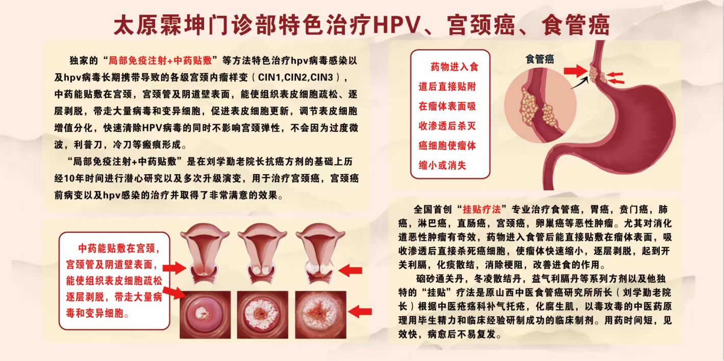 *采用原山西省中医食管癌专科医院刘学勤老院长研创的纯中药“挂贴疗法”专业治疗食管癌,胃癌,贲门癌,肺癌,肝癌,淋巴癌,直肠癌,宫颈癌等早中晚期的恶性肿瘤。尤其是对食管癌,贲门癌的治疗有自己的特色,药物能直接貼附在瘤体表面,吸收渗透后直接杀死癌细胞,能使瘤体逐层剥脱,继而进食通畅。