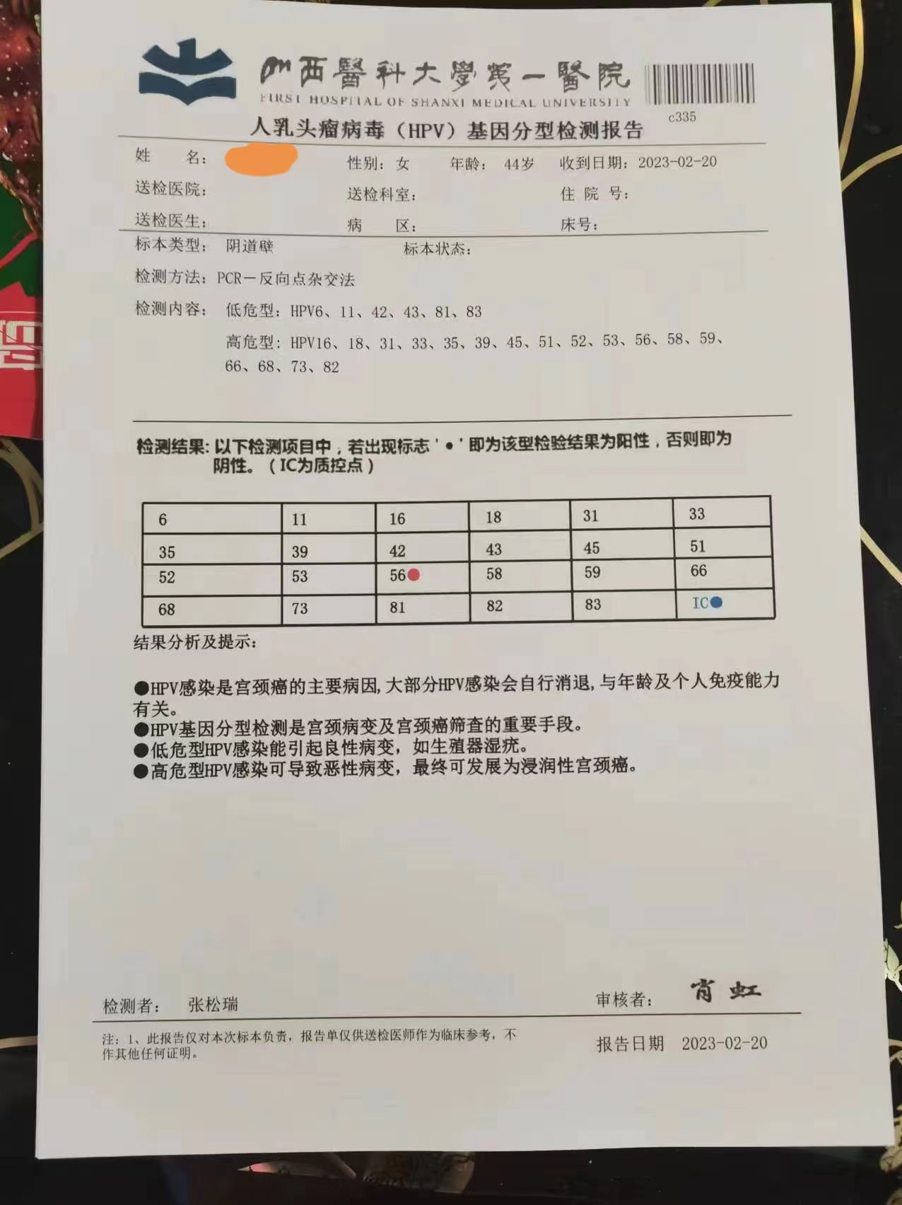 病例分享:山西太原的患者,44岁,2004年6月来我门诊就诊时在尚宁高科检测TCT非典型鳞状细胞不明确意义,hPV正常,治疗一周后复查tct正常。之后每年体检无异常,2022年10月22日来我门诊妇科体检,取标本后外送山大一院检测TCT正常,HPV56阳性,慢性宫颈炎,阴道壁53,56阳性,肛周53阳性,给予胸腺五肽+白介素局部免疫注射,四个部位上中药,口服HPV调理粉等方法治疗一个疗程。2023年2月20日在山大一院检测HPV宫颈已经转阴,继续同前治疗,加油!