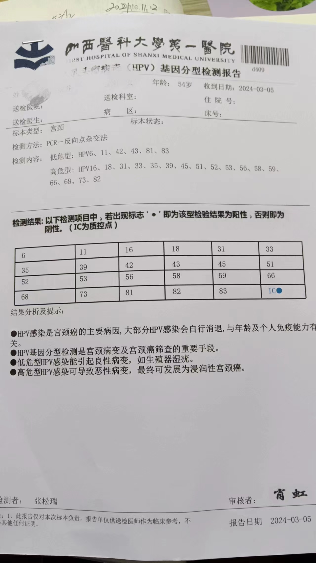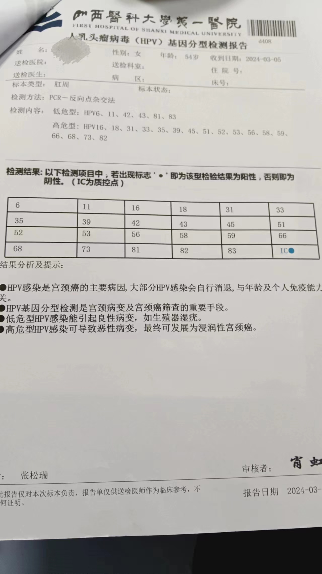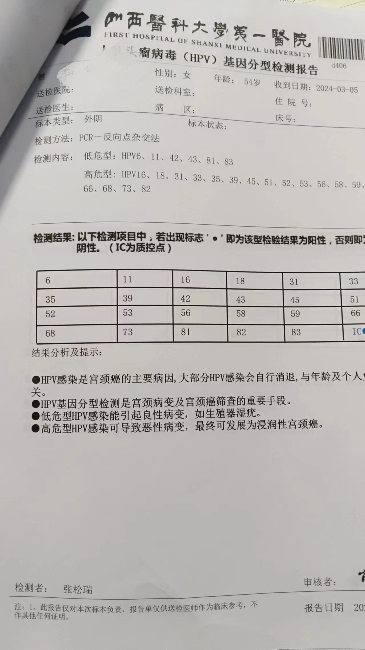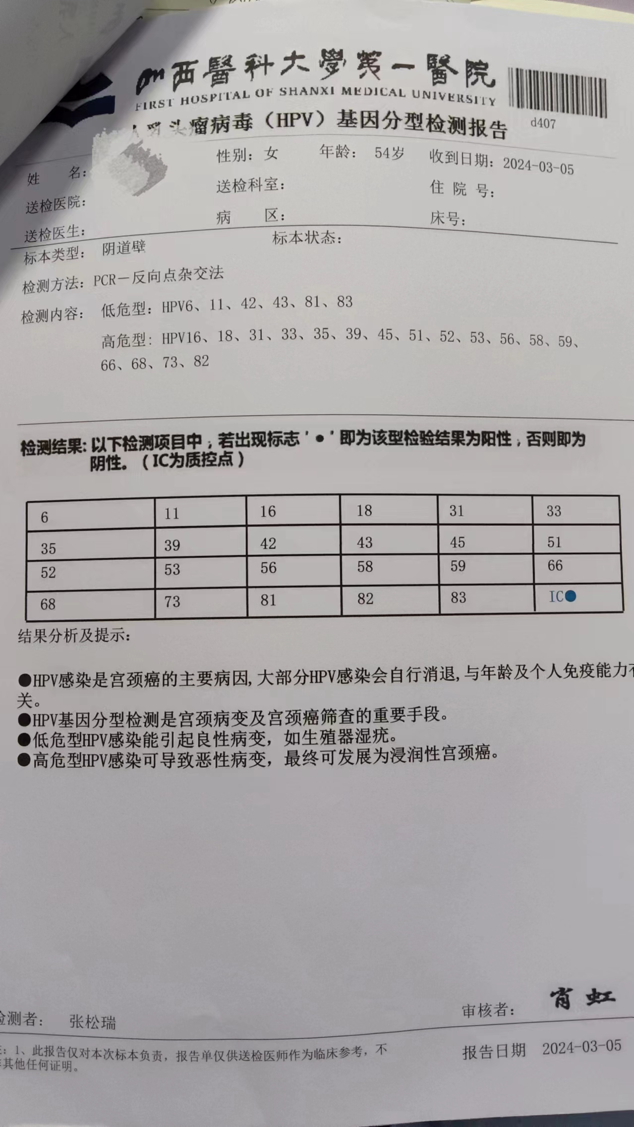 这个是2018年孝义的患者,HPV16阳性,三级病变,在北京锥切后一年hpv未转阴,来我门诊治疗5个月后hpv四个部位全部转阴,今年第五年复查tcthpv都正常!