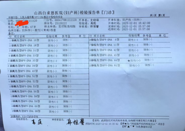 病例分享:山西太原的患者,66岁,2005年1月,在尚宁高科技医学检测中心检测 TCT正常,HPV 31阳性,白求恩医院 做*镜:宫颈口醋白阳性,碘染不着色。活检,慢性宫颈炎鳞状上皮增生。经朋友介绍来我门诊治疗,给予局部免疫注射一个疗程停药后,前几天当地自行检测hpv31,已转阴,恭喜她