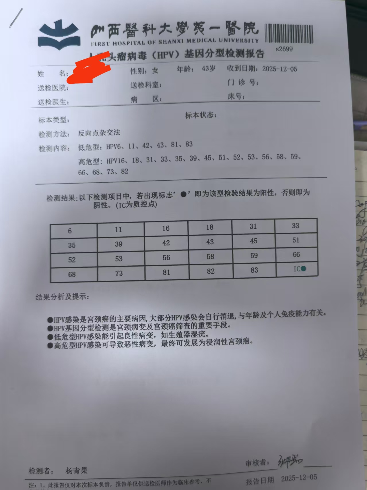 病例分享:山西忻州的患者.43岁,2019年11月18日因宫颈h p v16阳性,活检CIN3累腺在山大一院行宫颈环切术,术后干扰素,保妇康外用一年,2020年11月检测 t c t正常h p v16阳性,口服中药治疗,干扰素保妇康一年未转阴,2020年因h p v16阳性,活检宫颈CIN3,同年12月在山大医院再次行宫颈锥切术,术后口服中药半年,干扰素保妇康,生物蛋白敷料等交替使用一年多,检测t c t正常 h p v16阳性,2022年3月21日 在山大一院检测,TCT 少数非典型鳞状细胞 (不除外高级别病变)医院建议再次锥切。2022年4月3日,经朋友介绍来我门诊部治疗,当时在我门诊活检,宫颈3点CIN2到CIN3,给予微波一次,局部免疫注射口服hpv调理丸等方法治疗两个月后.6月29号检测hpv宫颈16阳性,*壁16 53阳性,外阴16 52阳性,继续同前治疗,因距离比较远,间断治疗,2024年3月16来我门诊检测,发现*壁溃疡,活检后左侧*壁顶端二级病变,免疫组化ki67阳性,p16阳性,告知其严重性,患者开始配合,给予局部免疫注射,四个部位红药贴敷,微波,口服hpv调理丸等方法积极治疗两个疗程后,前几天山大一院检测tct正常,hpv转阴!非常非常不容易,恭喜她